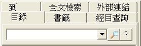 選單下,左欄「目錄」、「書籤」、「經目查詢」、「 到 」 ( 快速選取 ) 、「全文檢索」、「外部連結」、「經錄」各項,如下圖: