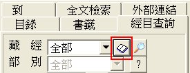 說明: 本功能是「佛教藏經目錄數位資料庫網站 (http://jinglu.cbeta.org)」 的單機實作版,目前依然是測試中的 Beta 版。 經錄查詢的範圍並不限於 CBETA 電子佛典集所收錄的大正藏與卍續藏,除了上述二藏之外,也包括了其他歷代漢文大藏經的目錄資料。 此版無法提供經文連結,目前僅提供查詢,並列出經文相關出處,未來會持續擴充功能與增修資料。 使用方法: 1. 在 「經目查詢」的頁籤按下紅框中的