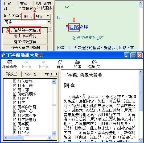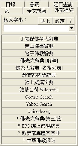 3. 按下所要使用的連結,例如「丁福保佛學大辭典」,即可將上一步驟輸入的文字傳給丁福保佛學大辭典。