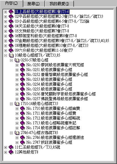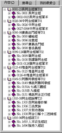 再打開「0001-25 長阿含經類」,還可以看看到第二層架構是:0001 長阿含經(22卷)、0002-0025 長阿含經單本等二類。如此,可以藉由樹狀結構的安排,有系統的深入經藏,而不會像直接跳進經藏大海一樣毫無頭緒,更能讓使用者瞭解經藏的系統架構,以便觸類旁通。如下圖所示: