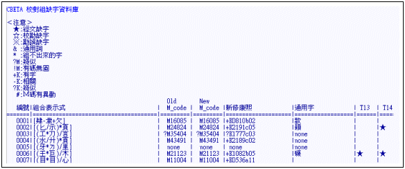 CBETA¹q¤l¦ò¨å¯Ê¦r³B²z¡@¡@¤¤µØ¹q¤l¦ò¨å¨ó·|¡]Chinese Buddhist Electronic Text Association¡A²ºÙCBETA¡^ªº¹q¤l¦ò¨å¸ê®Æ®w¡A¥H¡m¤j¥¿·s²ç¤jÂøg¡n¡]¥H¤U²ºÙ¡m¤j¥¿Âán¡^¡]¤jÂÃ¥Xª©®è¦¡·|ªÀ(c)¡^²Ä¤@¨÷¦Ü²Ä¤¤Q¤¨÷¡A¥H¤Î²Ä¤K¤Q¤¨÷¡A¦@p¤¤Q¤»¨÷ªº¸ê®Æ¬°©³¥»¡A¨Ã¥¿¦¡¨ú±o¸Ó©³¥»ª©Åv©Ò¦³ªÌ¡Ð¡Ð¡u¤jÂÃ¥Xª©®è¦¡·|ªÀ¡v¦³Ãö¿é¤J»P¤½¶}ªº±ÂÅv¡C¡@¡@¡m¤j¥¿Âán²Ä¤@¨÷¨ì²Ä¤K¤Q¤¨÷¡]¡m¤j¥¿Âán¤@¨÷§Y¤@¥U¡A¬°¤F©M¤º¤åªº¨÷°Ï§O¡A¥H¤U¥Î¡m¤j¥¿Âán²Ä´X¥U¥N´À²Ä´X¨÷¡AÁ×§K²V²c¡^¡A¥þ³¡ªº¦r¼Æ¡A¦ôp¬ù¤@»õ¦h¦r¡A¦Ó¹q¸£¯Ê¦r³¡¤À¡A¦b¥Ø«e¤w¸g§¹¦¨ªº¤¤Q¤»¥U¸g¤å¤¤¡A¦³¤@¸U¤¤dÓ¦r¥ª¥k¡]¤£¥]¬A±x¾è¦r¡^¡]µù 1¡^¡C ¡@¡@®Ú¾Ú²Îp¡A¤j¤½X²Ä¤@¯Å¦r¦³ 5,401 Ó¦r¡A²Ä¤G¯Å¦r 7,652 Ó¦r¡A¦@p 13,053 Ó¦r¡]Ken Lunde µÛ¡ACJKV Information Processing¡A¶72¡^¡C¥H¥Ø«e CBETA ©Ò¦¬¶°ªº¤@¸U¤¤dÓ¥ª¥kªº¡m¤j¥¿Âán¹q¸£¯Ê¦r¡A¼Æ¶q¶W¹L¤j¤½X¦r¼Æªº 13,053 Ó¡C ¡@¡@¥Ø«e CBETA ¾ã²z¡m¤j¥¿Âán¯Ê¦r±¡§Î¡A±q²Ä¤@¥U¨ì²Ä¤¤Q¥U¡A©Ò±o¯Ê¦rªñ¤»¤dÓ¡F¦Ó³Ì«á¤»¨÷¡]²Ä¤¤Q¤@¥U¦Ü²Ä¤¤Q¤¥U¤Î²Ä¤K¤Q¤¥U¡^¯Ê¦r¡A¦³¤K¤d¦hÓ¡C ¡@¡@¥H¤U²¤¶CBETA¾ã²z³o¨Ç¯Ê¦rªº¬yµ{¦p¤U¡G ¤@¡B®Õ¹ï²Õ¯Ê¦r¾ã²z ¡@¡@¦b®Õ¹ï²Õ¾ã²z¸g¤å®É¡A¥H¡m¤j¥¿Âán¨C¥U¬°³æ¦ì°µ¯Ê¦rªº¦¬¶°¡A¦¬¶°¨ìªº¯Ê¦r¡A°£¤F¤Á¥X¯Ê¦r¹ÏÀÉ¥~¡A¨Ã¥B¥[¥H½s¸¹¡AµM«á§â©Ò±o¨ìªº¯Ê¦r¥Î²Õ¦r¦¡µ¥¤è¦¡ªí¥Ü¡A´£¨Ñ¬ãµo²Õ¶i¤@¨B³B²z©MÀ³¥Î¡C ¡@¡@¦Ó¨Ï¥Î²Õ¦r¦¡¾ã²z¡m¤j¥¿Âán¹q¸£¯Ê¦rªº¤è¦¡¡AÀuÂI¦b©ó¡A¦]¬°¨S¦³¨Ï¥Î³y¦rÀÉ¡A©Ò¥H¤£»Ýn¦w¸Ë¡A¥ô¦ó¤¤¤å¨t²Îªº¹q¸£¡A³£¥i¥HÅã¥Ü¡C ¡@¡@®Õ¹ï²Õ´N©Ò¦¬¶°ªº¯Ê¦rÓ§O½s¸¹¡B²Õ¦r¡A½s¸¹§Î¦¡¦p CB0001 ¡A´N¬O¨ú CBETA ÁY¼g¦r¥Àªº«e¨âÓ¦r¥À CB ¡A¥[¤W¥|½X¼Æ¦r²Õ¦¨¡F¹ï©ó³o¼Ëªº½s¸¹¡A§Ú̲ºÙ¡uCB½X¡v¡C¨C¤@²Õ CB ½X¹ïÀ³¤@ӯʦr¡B¤@²Õ²Õ¦r¦¡¡C²Õ¦r¦¡ªºªí¥Ü¤è¦¡¡A´N¬O§â¦r¥[¥H¼W´î²Õ¦X¡A¨Ó±Ôz¬YÓ¦rªº¼Ë¤l¡A¦p[µ²-¦N+¥B]¡B[©y-¥B+¤l]¡A´N¬O¡u²Õ¦r¡v³o¨âÓ¦r¥Î²Õ¦r¦¡ªí¥Üªº§Î¦¡¡C ¡@¡@CBETA¯Ê¦rªº²Õ¦r¦¡¡A¥Î¥[´î¼°£µ¥¹Bºâ²Å¸¹¨Óªí¥Ü¡A¦@¨Ï¥Î¤QӲŸ¹¡F³o¤QӲŸ¹¡A¨ä¤¤¤CӡССu*¡v¡B¡u/¡v¡B¡u@¡v¡B¡u-¡v¡B¡u+¡v¡B¡u(¡v¡B¡u)¡v¡A¥Î¨Óªí¥Ü¦rªº¥ª¥k¤W¤U¤À¦XÃö«Y¡C¦Ó°Ý¸¹¡Ð¡Ð¡u?¡v¡Aªí¥Ü¬Y¦rµLªk¥Î²Õ¦r¤è¦¡ªí¥Üªº³¡¤À¡C¥t¥~¤GÓ¥b§Î²Å¸¹¡Ð¡Ð¡u[¡v¡B¡u]¡v¡Aªí¥Ü²Õ¦r¦¡ªº°_¨´¡C¥b§Î²Å¸¹[ ]¤¤¡A´N¬O²Õ¦rÃö«Y¦¡¸Ì¦rªº¤À¦XÃö«Y¡F²Ä¤@²Õ¤CÓ¡A¥[¤W°Ý¸¹¡Ð¡Ð¡u?¡v¡A¥H¤Î²Ä¤G²Õ¨âÓ¡A¨Ì¦rªº§Î¬Û¡Aºc¦¨¤@Ó§¹¾ãªº²Õ¦rÃö«Y¦¡¡A²ºÙ²Õ¦r¦¡¡C¥H¤Uªí»¡©ú¡G ¡i²Å¸¹½d¨Ò»¡©úªí¡j