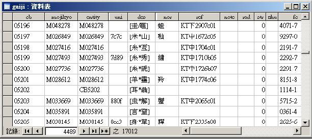 ¤G¡B¬ãµo²Õ¯Ê¦r¾ã²z ¡@¡@¬ãµo²Õ¨ú±o®Õ¹ï²Õ©Ò´£¨Ñªº¯Ê¦r¸ê®Æ«á¡A§@¥H¤U¤TÓ³¡¤Àªº³B²z¡C(1) ¥[¤JACCESS(r)®æ¦¡ªºgaiji¡]¯Ê¦r¡^¯Ê¦rªí¡A(2) ¬d¸ß¡m¤µ©õ¤å¦rÃè¡nªº¦r½X¡]MOJIKYO(r) CODE¡A²ºÙM½X¡^¡BUNICODE½X¡B³q¥Î¦r¡Bª`µ¡A¨Ãµù©ú¥X³B¡]ªì´Á¥Ñ®Õ¹ï²Õt³d¡^¡A(3) ½s©w¯Ê¦rªº³¡º¡Bµ§µe¥H¤Î¥|¨¤¸¹½X¡C ¡@¡@gaiji¯Ê¦rªí¡]¨£¹Ï¤@¡^¡A¥]¬A¡GCB½X¡]cb¡^¡BM½X¡]mojikyo¡^¡B¢ãnicode¡]uni¡^¡B²Õ¦r¦¡¡]des¡^¡B³q¥Î¦r¡]nor¡^¡Bµù°O¡]note¡^¡B³¡º¡]rad¡^¡Bµ§µe¡]str¡^¡B¦rµ¡]zhu¡^¡B¥|¨¤¸¹½X¡]fc¡^¡A¥H¤Î¯Ê¦r¹ÏÀÉ¡]¨£¹Ï¤G¡^¡C