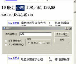 一、進入首頁之後,連結在首頁上的「CBETA經錄」或「大正藏經錄」,然後進入此頁面,按「Ctrl-F」(先按住Ctrl鍵,並同時按下F鍵)。此時會出現「尋找」的對話窗,再輸入要查的經文之後,按下Enter鍵,即可在經錄之中逐一找查。
