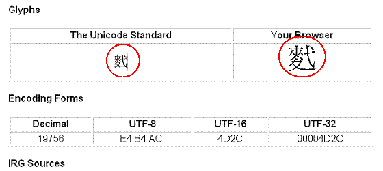 Unicode 3.1 的標準包含了七萬多個漢字,有許多字都是罕見的文字,些許筆劃差異的兩個字很可能就是不同的字,因此在輸入與判斷上就要特別小心。 目前遇到最大的問題,就是發現一般利用字形呈現的字與 Unicode 網站 (http://www.cbeta.org) 的圖檔不同,我們的原則是以圖檔為判斷的標準,理由是未來各家的字型不一定會相同,因此無法以字型來判斷,所以用圖檔來判斷才是合理的。 以 CBETA組字式 [麩-夫+弋] http://www.unicode.org/cgi-bin/GetUnihanData.pl?codepoint=4D2C 底下是 Unicode 網站呈現的畫面,我們可以看到, 網頁上的圖檔 ( The Unicode Standard 該欄 )「