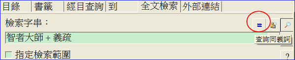 只是,智顗與智者大師會是同一人嗎?要如何才能確認呢?很簡單,CBReader 有個很棒的功能--同義詞,就在全文檢索畫面中右方有個等號,按下它。