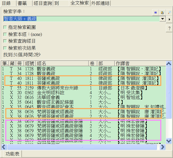 ■ 如何查找經文或經目 時常有讀者來信詢問如何使用 CBReader 查詢想找的經文或經目,剛好最近有個實例,透過我們的步驟,相信可以讓大家更有概念。 讀者的來信是:「弟子新學研讀李圓淨居士彙編之梵網經菩蕯戒本彙解,請問要查詢那一部經典來對照呢?」 首先請看此書的序:「李圓淨居士近將智者大師梵網經義疏及蓮池大師戒疏發隱、蕅益大師梵網合註,萃為一編...」 在序裡有提到出處來自3本書,並有作者及經名,建議使用[經目查詢] 或[全文檢索]來進行。這裡我們用[全文檢索],而且為增加搜尋準確度,在檢索字串欄位輸入"作者+部份的經名",在結果欄會看到想找的資料。請見下圖。