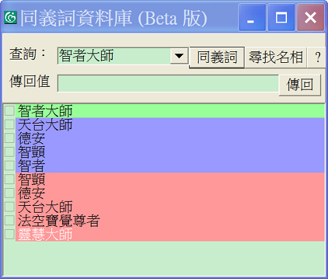 接著在同義詞的查詢欄裡輸入"智者大師"(或"智者"),就會在結果欄看到"智者大師" 其他的名號。(詳細操作可按下[問號]。)