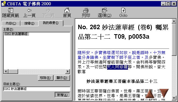 當您讀經讀到一半,必需離開從事其他的工作時,您可以選取「我的最愛」頁籤,並按選「新增」,系統便會幫您將目前的經目記起來,方便您下次閱讀。 您也可以利用「移除」的功能除去不必要的位置記錄,或是「顯示」來查看您以前所記錄下來的位置。