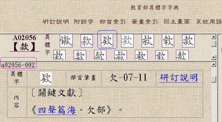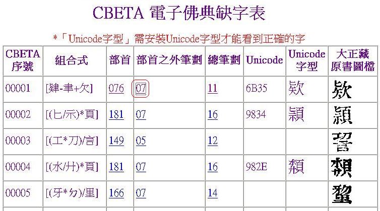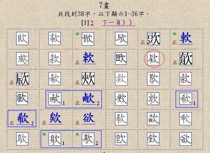 以實務經驗而言,建議先點取「部首之外筆劃」,如 00001 中的「07」,會出現【圖二】的網頁!