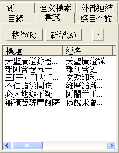 在書籤視窗選擇經名,再按下「移除」,就會將該經從書籤中移除。