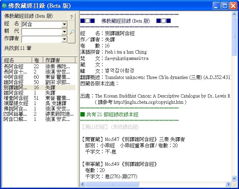 2. 可輸入查詢的欄位有三個,分別是:經名、朝代、作譯者,使用者可輸入需要的欄位進行查詢。 3. 輸入後按下右方的搜尋按鈕,即可列出相關的經目。 4. 在列出的經目上連點二下,即會列出該經在各大藏經的相關資料。 最上方為別譯雜阿含經的呈現畫面,其中灰色的「【房山石經】 (未收錄此經)」表示在房山石經中沒有收錄此經,故以淡灰色呈現。