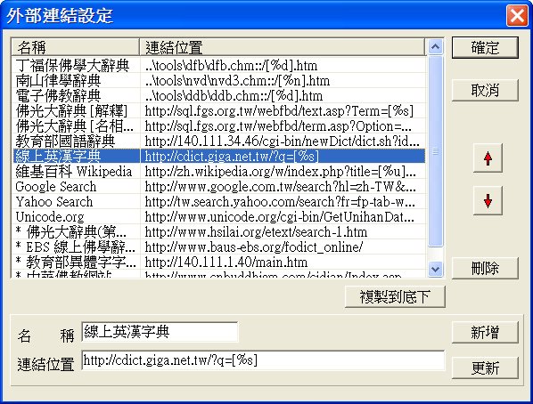 以「教育部異體字字典」為例,它目前無法很容易地傳入所要查詢的文字,所以我們目前以直接開啟的方式開啟它,因此只要在「連結位置」填入其網址即可,如下: