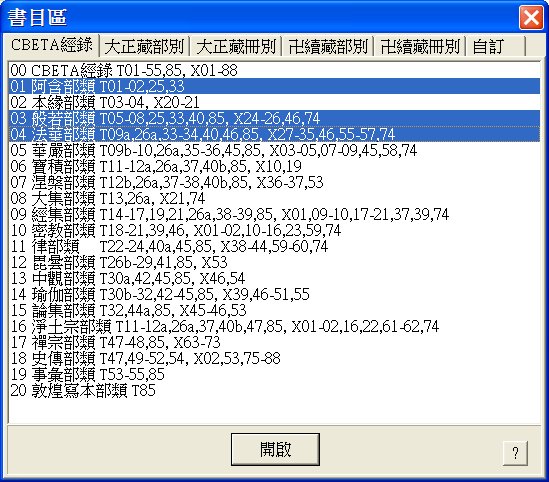 「CBETA 經錄」、「大正藏部別」、「大正藏冊別」、「卍續藏部別」、「卍續藏冊別」、「自訂書目」。