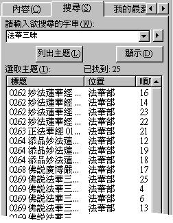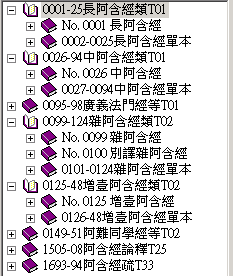 再打開「0001-25 長阿含經類」,還可以看看到第二層架構是:0001 長阿含經(22卷)、0002-0025 長阿含經單本等二類。如此,可以藉由樹狀結構的安排,有系統的深入經藏,而不會像直接跳進經藏大海一樣毫無頭緒,更能讓使用者瞭解經藏的系統架構,以便觸類旁通。如下圖所示: