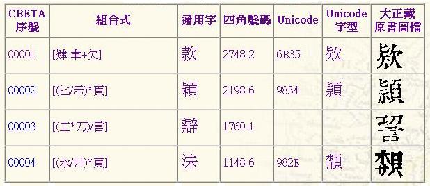 CBETA¹q¤l¦ò¨å¯Ê¦r³B²z¡@¡@¤¤µØ¹q¤l¦ò¨å¨ó·|¡]Chinese Buddhist Electronic Text Association¡A²ºÙCBETA¡^ªº¹q¤l¦ò¨å¸ê®Æ®w¡A¥H¡m¤j¥¿·s²ç¤jÂøg¡n¡]¥H¤U²ºÙ¡m¤j¥¿Âán¡^¡]¤jÂÃ¥Xª©®è¦¡·|ªÀ(c)¡^²Ä¤@¨÷¦Ü²Ä¤¤Q¤¨÷¡A¥H¤Î²Ä¤K¤Q¤¨÷¡A¦@p¤¤Q¤»¨÷ªº¸ê®Æ¬°©³¥»¡A¨Ã¥¿¦¡¨ú±o¸Ó©³¥»ª©Åv©Ò¦³ªÌ¡Ð¡Ð¡u¤jÂÃ¥Xª©®è¦¡·|ªÀ¡v¦³Ãö¿é¤J»P¤½¶}ªº±ÂÅv¡C¡@¡@¡m¤j¥¿Âán²Ä¤@¨÷¨ì²Ä¤K¤Q¤¨÷¡]¡m¤j¥¿Âán¤@¨÷§Y¤@¥U¡A¬°¤F©M¤º¤åªº¨÷°Ï§O¡A¥H¤U¥Î¡m¤j¥¿Âán²Ä´X¥U¥N´À²Ä´X¨÷¡AÁ×§K²V²c¡^¡A¥þ³¡ªº¦r¼Æ¡A¦ôp¬ù¤@»õ¦h¦r¡A¦Ó¹q¸£¯Ê¦r³¡¤À¡A¦b¥Ø«e¤w¸g§¹¦¨ªº¤¤Q¤»¥U¸g¤å¤¤¡A¦³¤@¸U¤¤dÓ¦r¥ª¥k¡]¤£¥]¬A±x¾è¦r¡^¡]µù 1¡^¡C ¡@¡@®Ú¾Ú²Îp¡A¤j¤½X²Ä¤@¯Å¦r¦³ 5,401 Ó¦r¡A²Ä¤G¯Å¦r 7,652 Ó¦r¡A¦@p 13,053 Ó¦r¡]Ken Lunde µÛ¡ACJKV Information Processing¡A¶72¡^¡C¥H¥Ø«e CBETA ©Ò¦¬¶°ªº¤@¸U¤¤dÓ¥ª¥kªº¡m¤j¥¿Âán¹q¸£¯Ê¦r¡A¼Æ¶q¶W¹L¤j¤½X¦r¼Æªº 13,053 Ó¡C ¡@¡@¥Ø«e CBETA ¾ã²z¡m¤j¥¿Âán¯Ê¦r±¡§Î¡A±q²Ä¤@¥U¨ì²Ä¤¤Q¥U¡A©Ò±o¯Ê¦rªñ¤»¤dÓ¡F¦Ó³Ì«á¤»¨÷¡]²Ä¤¤Q¤@¥U¦Ü²Ä¤¤Q¤¥U¤Î²Ä¤K¤Q¤¥U¡^¯Ê¦r¡A¦³¤K¤d¦hÓ¡C ¡@¡@¥H¤U²¤¶CBETA¾ã²z³o¨Ç¯Ê¦rªº¬yµ{¦p¤U¡G ¤@¡B®Õ¹ï²Õ¯Ê¦r¾ã²z ¡@¡@¦b®Õ¹ï²Õ¾ã²z¸g¤å®É¡A¥H¡m¤j¥¿Âán¨C¥U¬°³æ¦ì°µ¯Ê¦rªº¦¬¶°¡A¦¬¶°¨ìªº¯Ê¦r¡A°£¤F¤Á¥X¯Ê¦r¹ÏÀÉ¥~¡A¨Ã¥B¥[¥H½s¸¹¡AµM«á§â©Ò±o¨ìªº¯Ê¦r¥Î²Õ¦r¦¡µ¥¤è¦¡ªí¥Ü¡A´£¨Ñ¬ãµo²Õ¶i¤@¨B³B²z©MÀ³¥Î¡C ¡@¡@¦Ó¨Ï¥Î²Õ¦r¦¡¾ã²z¡m¤j¥¿Âán¹q¸£¯Ê¦rªº¤è¦¡¡AÀuÂI¦b©ó¡A¦]¬°¨S¦³¨Ï¥Î³y¦rÀÉ¡A©Ò¥H¤£»Ýn¦w¸Ë¡A¥ô¦ó¤¤¤å¨t²Îªº¹q¸£¡A³£¥i¥HÅã¥Ü¡C ¡@¡@®Õ¹ï²Õ´N©Ò¦¬¶°ªº¯Ê¦rÓ§O½s¸¹¡B²Õ¦r¡A½s¸¹§Î¦¡¦p CB0001 ¡A´N¬O¨ú CBETA ÁY¼g¦r¥Àªº«e¨âÓ¦r¥À CB ¡A¥[¤W¥|½X¼Æ¦r²Õ¦¨¡F¹ï©ó³o¼Ëªº½s¸¹¡A§Ú̲ºÙ¡uCB½X¡v¡C¨C¤@²Õ CB ½X¹ïÀ³¤@ӯʦr¡B¤@²Õ²Õ¦r¦¡¡C²Õ¦r¦¡ªºªí¥Ü¤è¦¡¡A´N¬O§â¦r¥[¥H¼W´î²Õ¦X¡A¨Ó±Ôz¬YÓ¦rªº¼Ë¤l¡A¦p[µ²-¦N+¥B]¡B[©y-¥B+¤l]¡A´N¬O¡u²Õ¦r¡v³o¨âÓ¦r¥Î²Õ¦r¦¡ªí¥Üªº§Î¦¡¡C ¡@¡@CBETA¯Ê¦rªº²Õ¦r¦¡¡A¥Î¥[´î¼°£µ¥¹Bºâ²Å¸¹¨Óªí¥Ü¡A¦@¨Ï¥Î¤QӲŸ¹¡F³o¤QӲŸ¹¡A¨ä¤¤¤CӡССu*¡v¡B¡u/¡v¡B¡u@¡v¡B¡u-¡v¡B¡u+¡v¡B¡u(¡v¡B¡u)¡v¡A¥Î¨Óªí¥Ü¦rªº¥ª¥k¤W¤U¤À¦XÃö«Y¡C¦Ó°Ý¸¹¡Ð¡Ð¡u?¡v¡Aªí¥Ü¬Y¦rµLªk¥Î²Õ¦r¤è¦¡ªí¥Üªº³¡¤À¡C¥t¥~¤GÓ¥b§Î²Å¸¹¡Ð¡Ð¡u[¡v¡B¡u]¡v¡Aªí¥Ü²Õ¦r¦¡ªº°_¨´¡C¥b§Î²Å¸¹[ ]¤¤¡A´N¬O²Õ¦rÃö«Y¦¡¸Ì¦rªº¤À¦XÃö«Y¡F²Ä¤@²Õ¤CÓ¡A¥[¤W°Ý¸¹¡Ð¡Ð¡u?¡v¡A¥H¤Î²Ä¤G²Õ¨âÓ¡A¨Ì¦rªº§Î¬Û¡Aºc¦¨¤@Ó§¹¾ãªº²Õ¦rÃö«Y¦¡¡A²ºÙ²Õ¦r¦¡¡C¥H¤Uªí»¡©ú¡G ¡i²Å¸¹½d¨Ò»¡©úªí¡j