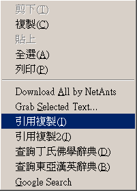 首先,「引用複製」選項,和原來的引用複製是一樣的,其呈現的次序依次為:「內文」《經名》(出處)。例如: