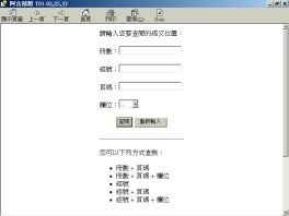 這的確是一件十分不便的事情。可惜在HTML HELP 1.x版之中,無法支援Cookie等功能,因此不能記錄下來原先輸入的資料。我們目前已著手研究,使用其他的方式(如框架頁)來呈現的可能性。 在此之前,您可以利用檢索的方式來找到您要的經文,並讓檢索欄位替您記下您查詢過的資料。 使用檢索欄位查詢某部經典的方式如下: 冊數:請輸入"T"加上阿拉伯數字的冊數(兩位數),如第一冊:T01,第五十五冊:T55。 經號:請輸入"No. "加上阿拉伯數字的經號(至少二位數,不足時前方補零),並在前後各加上雙引號。如第一經:"No. 01",第一○○○經:"No. 1000"。這個方法有一個優點,但也是缺點,就是經文中有關連的經文時,會出現相關的經號,因此會出現其他的內容,單獨使用時要留意。 經號,目錄:如果只是要找查某經的目錄,可輸入四位數的經號(不足前方補零),並選取「僅搜尋標題」選項。 頁碼欄位:"p"加上四碼頁碼(不足處前方補零),另加上欄位代碼。上欄"a",中欄"b",下欄"c"。如第二頁上欄:p0002a。可單獨查詢頁數,但不建議單獨查詢欄位。 搜尋時,輸入要找的資訊,並用空白分開來。如第一冊第三經:"No. 03" T01。第二冊第三百八十二頁下欄:T02 p0382c。 如此一來,您就可以記錄下來要找的資訊,輸入錯誤時也容易發現問題呢! 如果有任何問題或是建議,歡迎來信指導。 如果您也有使用心得想和大家分享,歡迎來信。凡經刊登,敝會簡備小禮物乙份以茲酬謝。 |