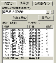 光碟使用小秘訣之 在推廣活動時,來賓詢及部類目錄層次很多,對於不熟悉部類目錄的使用者,要如何才能找到某一部特定的經典呢? 接下來我們提供兩個方法給大家參考: 一、使用搜尋功能。 打開CBETA.chm整個部類的經文檔案,在搜尋欄位輸入經名,然後加上空白(或是 AND ),再輸入「大正新脩」四個字,即可限制搜尋範圍在各經文的目錄之中。 例如:「普門品 大正新脩大藏經」
